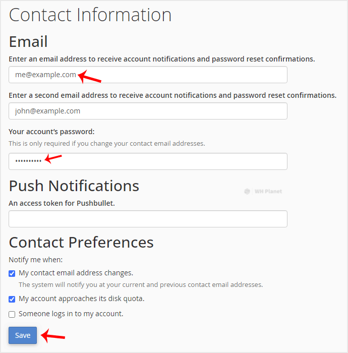 If you want to receive a notification on reaching your disk quota, bandwidth usage limit or wish to update the cPanel's contact information, follow these steps.